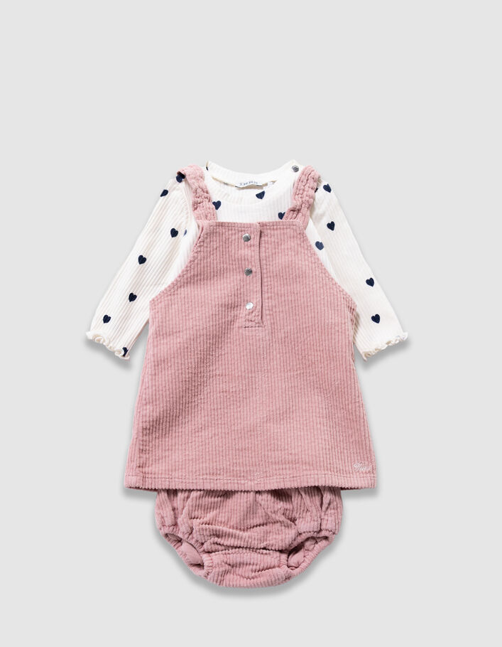 Ensemble t-shirt blanc, robe et bloomer roses bébé fille
