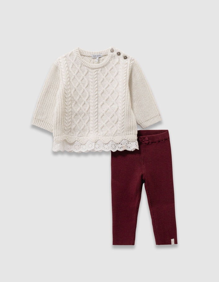 Ensemble pull écru et leggings bordeaux tricot bébé fille