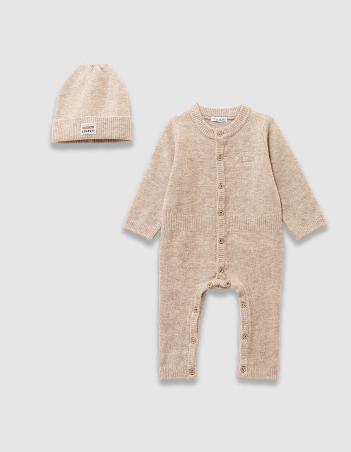 Ensemble combinaison et bonnet beige tricot bébé garçon