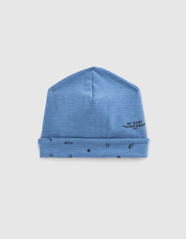 Bonnet réversible bleu et imprimé rock coton bio bébé