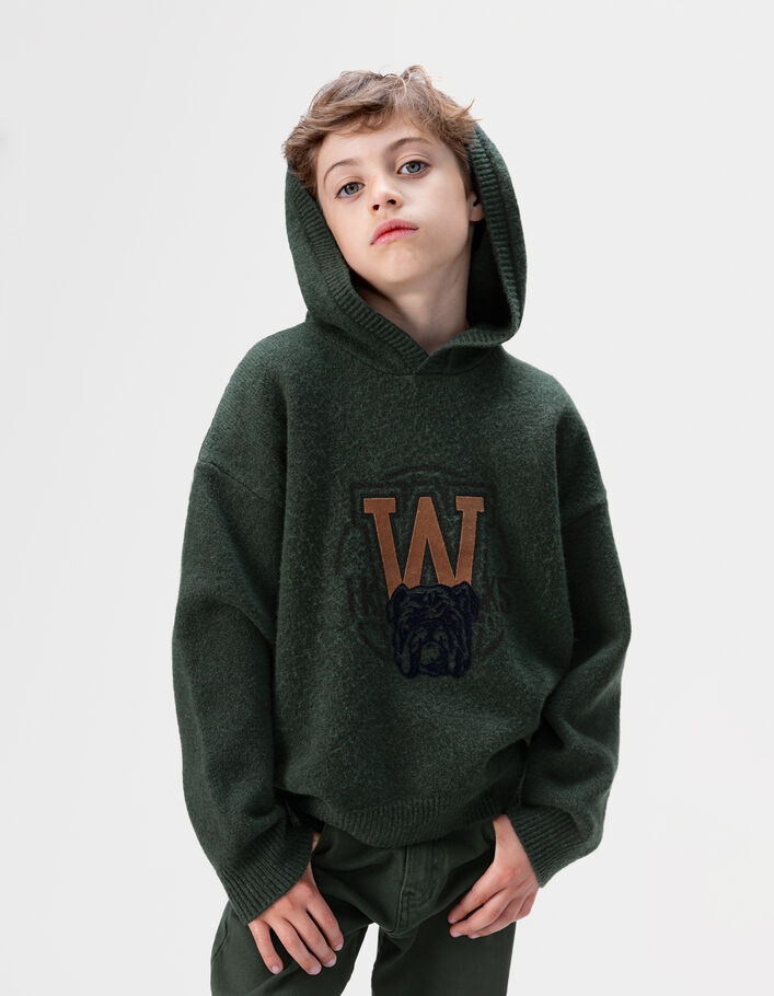 Pull à capuche vert tricot visuel chien garçon