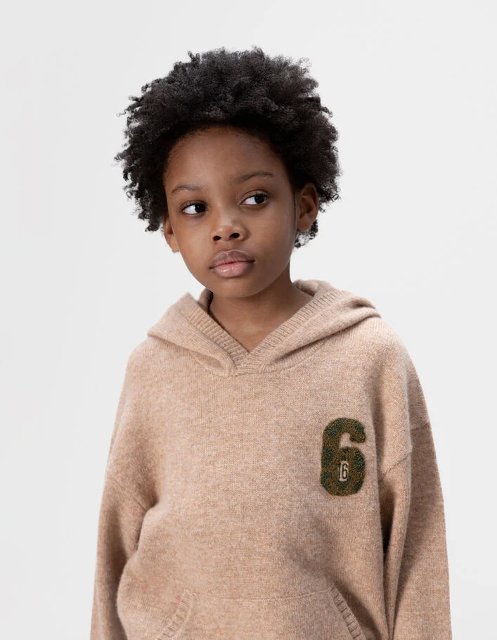 Pull à capuche beige tricot chiné badge chiffre garçon