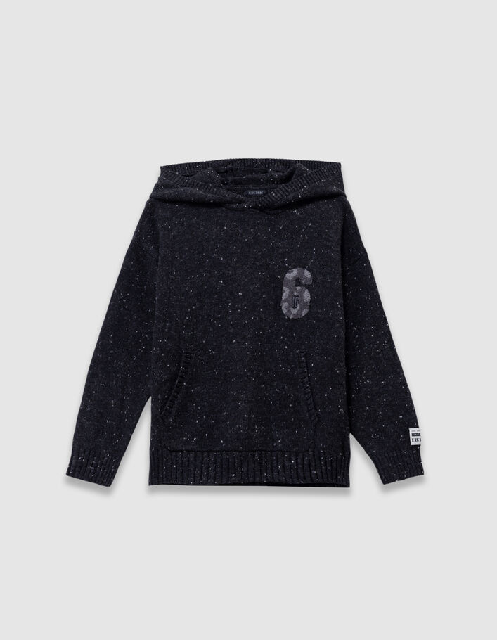 Pull à capuche noir tricot chiné badge chiffre garçon