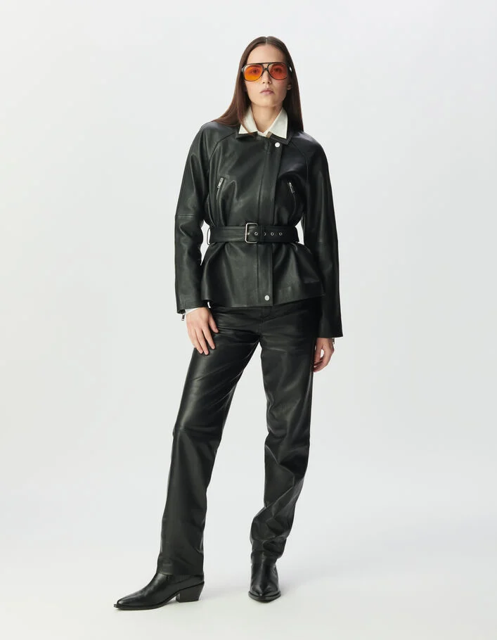 Blouson noir oversize cuir grainé esprit motard Femme