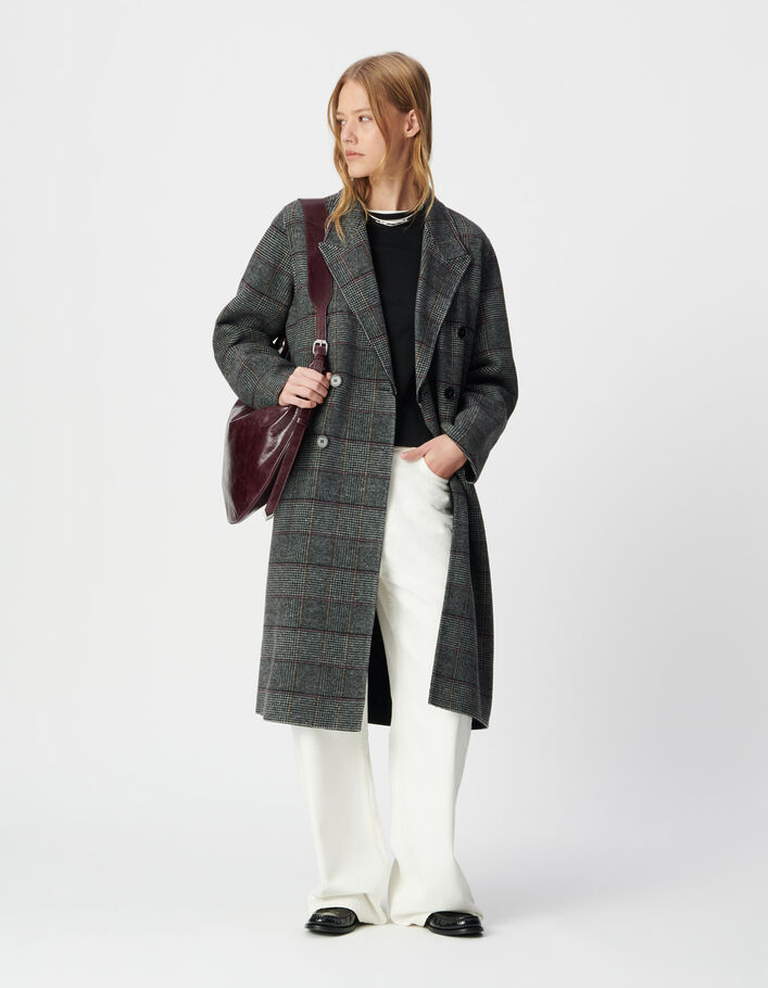 Manteau long gris motif carreaux boutonnage croisé Femme