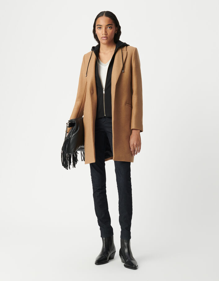 Manteau mi-long camel capuche amovible Femme