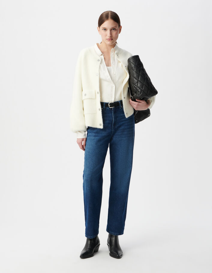 Cardigan blanc tricot duveteux poches à rabat pressionné Femme