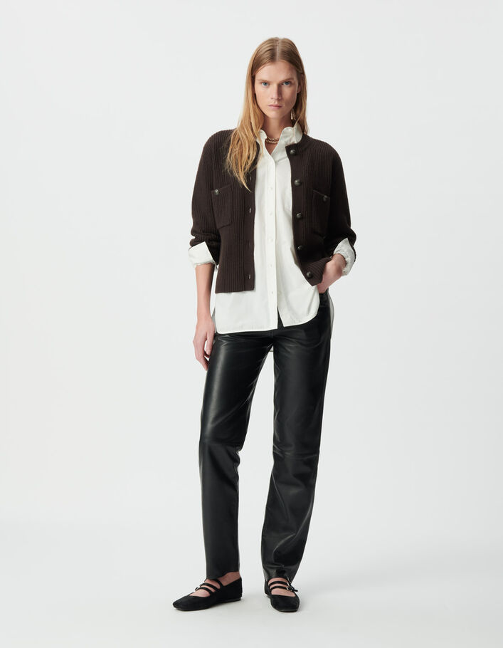 Cardigan court marron 100% laine côtelée Femme
