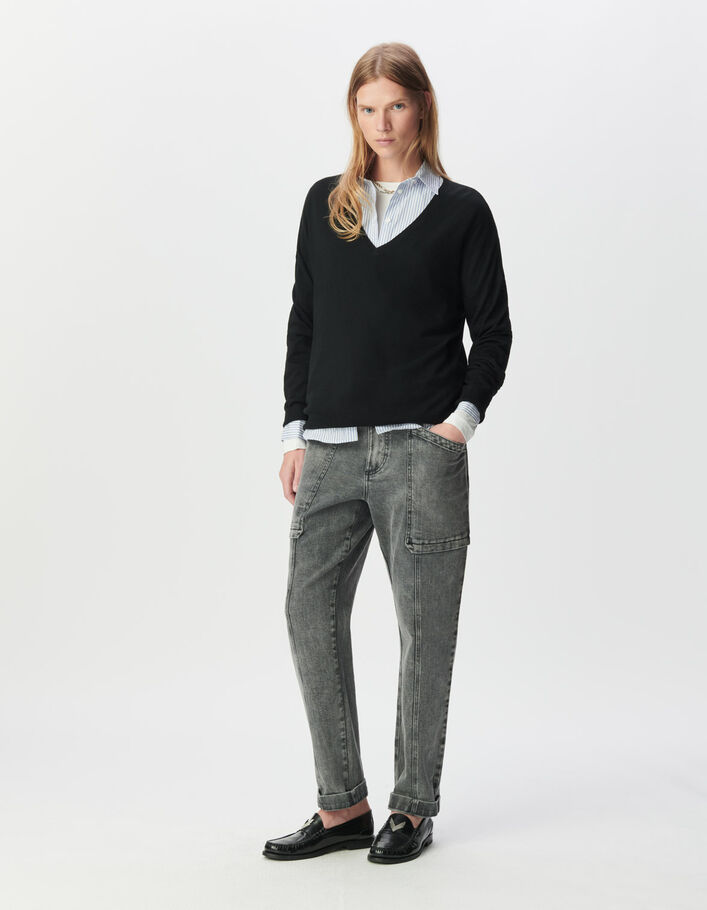 Pull noir tricot 100% laine encolure V Femme