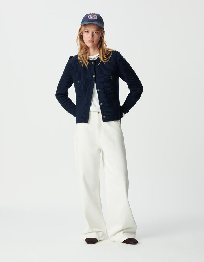 Cardigan court marine 100% laine côtelée Femme