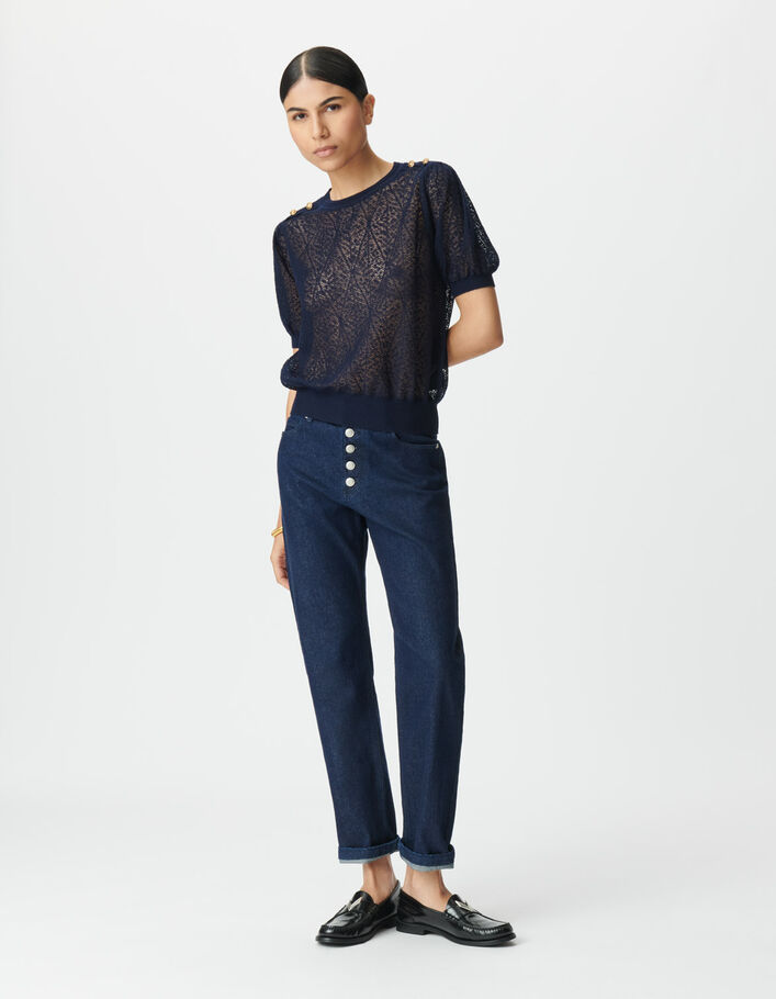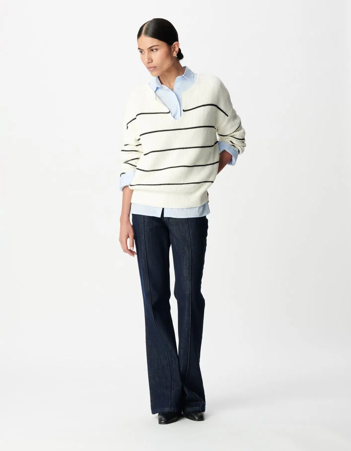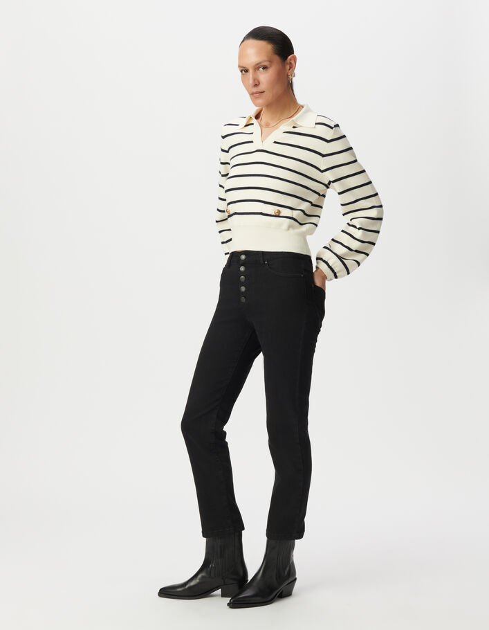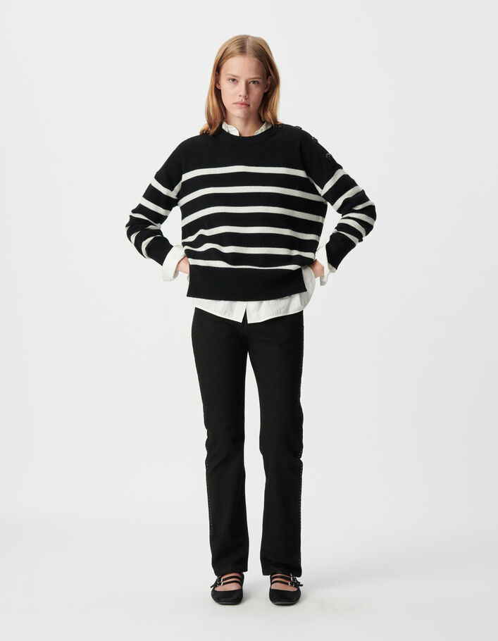 Pull marinière noir écru 100% laine boutons épaule Femme
