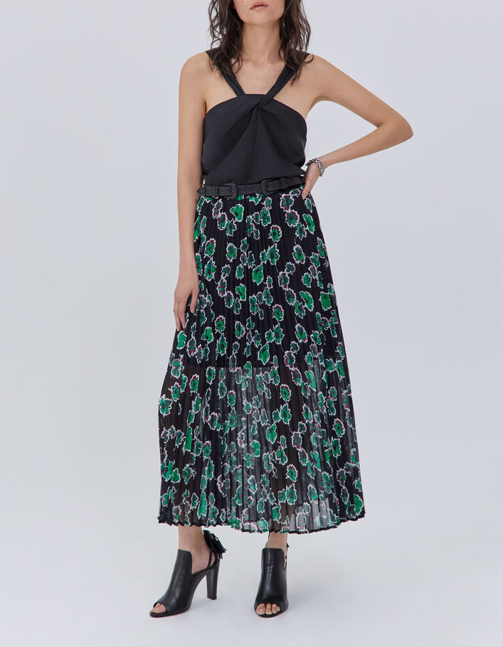 Jupe longue noire imprimé maxi floral plissée Femme