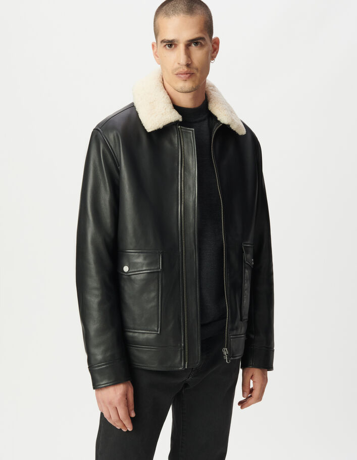 Blouson aviateur noir en cuir sherpa amovible Homme
